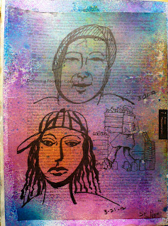 Saturday: I know I've already posted this one, but I used an water soluable oil pastel over the whole thing, then rubbed it in with my fingers. Some of it came off the dried acrylics, some didn't. I like it better than the white background. It doesn't look so stark. I still need to bring out the images, so it is still a wip. I also gessoed two more pages.